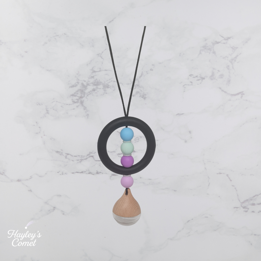 Float through every drive with the Dreamscape Orbit Car Charm. Baby blue, mint, purple and lilac beads orbit a sleek black ring, finished with a natural wood diffuser bottle that slowly releases your favourite scent. It’s a soft aurora of colour for your rear‑view mirror – calm, dreamy and perfectly celestial.