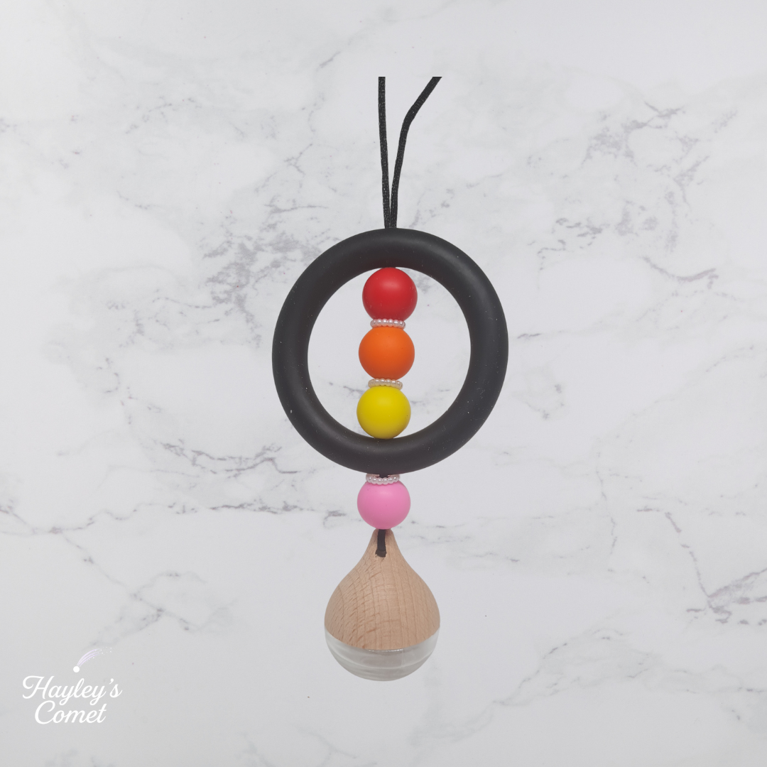 The Solar Flare Car Charm layers red, orange, yellow and pink beads around a sleek black orbit ring, finished with a natural wood diffuser bottle. Inspired by sunrise intensity, it brings controlled colour and subtle fragrance to your car without overwhelming your interior.